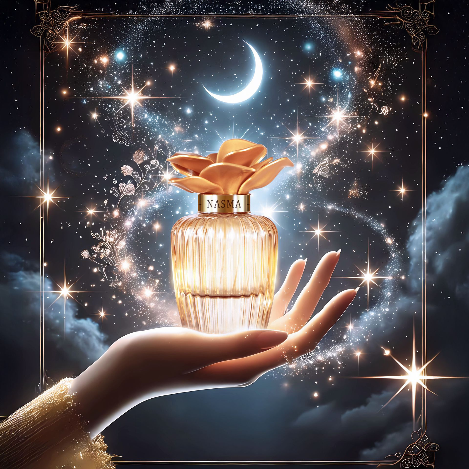 Nasma opens with tropical fruity top notes, delivering an immediate burst of freshness and vitality. The heart unfolds with sweet, green floral accords, evoking lush gardens and natural beauty. Finally, the fragrance rests on a sensual base of amber and woody notes, leaving a soft, radiant trail that lingers delicately.