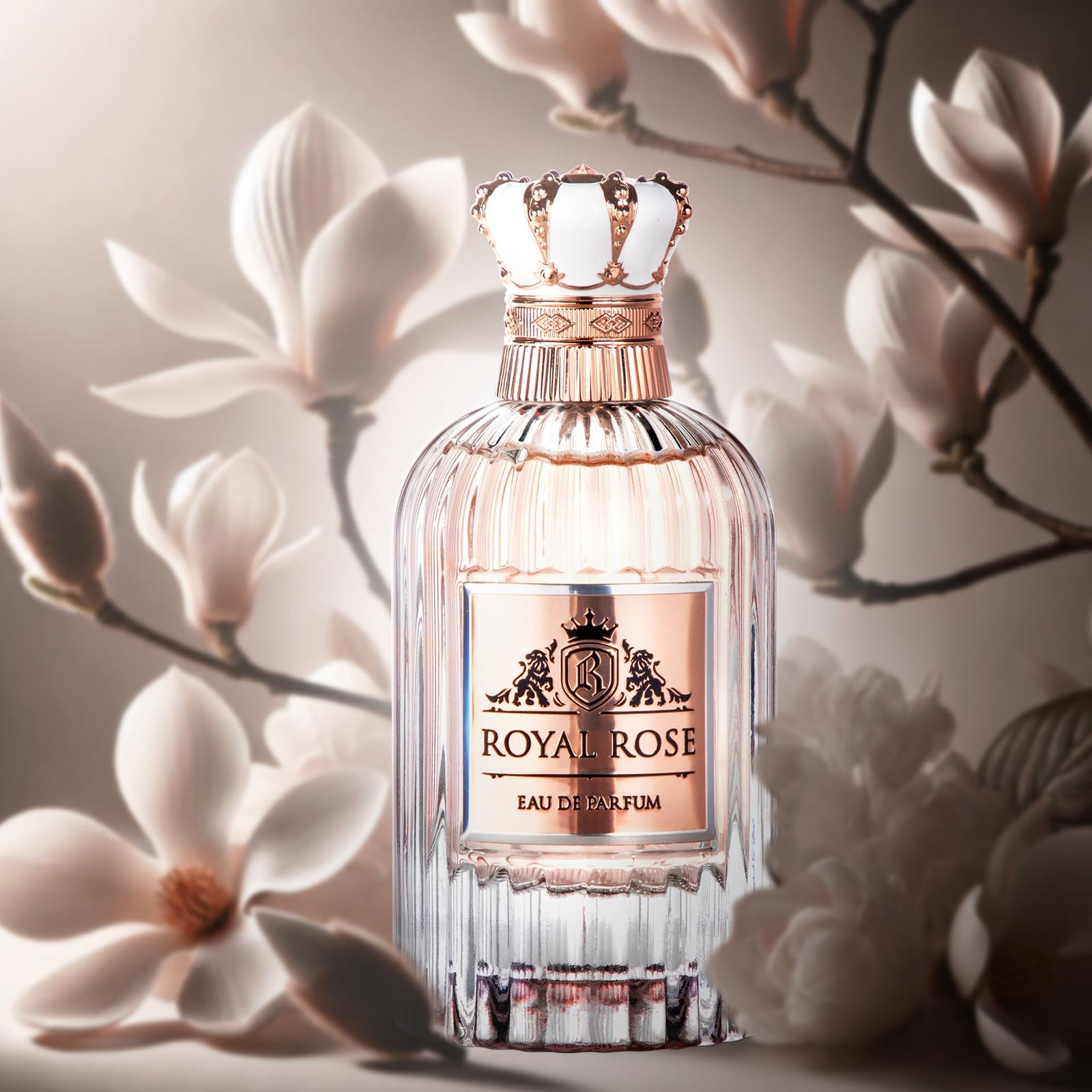 Presented in a fluted crystal-clear bottle with a pink gold royal cap, reflecting the fragrance’s regal character.