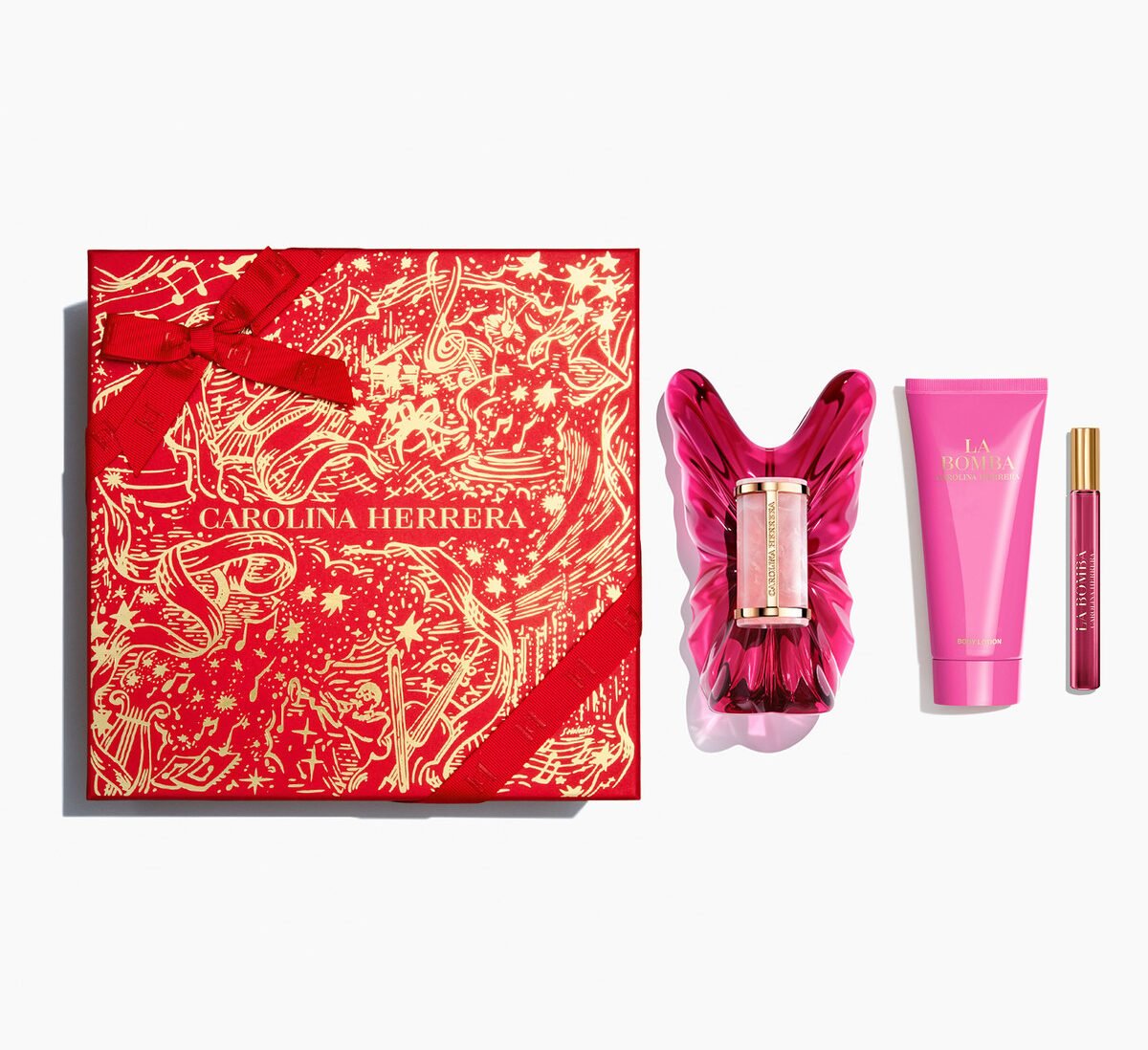 Discover Carolina Herrera La Bomba 3 Pieces Gift Set featuring the new 2025 Oriental Floral Eau de Parfum for women. Includes EDP 80ml, Body Lotion 100ml, and 10ml travel spray. A luxurious, long-lasting fragrance with Pitahaya, Peony, Frangipani, Vanilla, and Patchouli notes. Shop premium original perfumes online at best price.